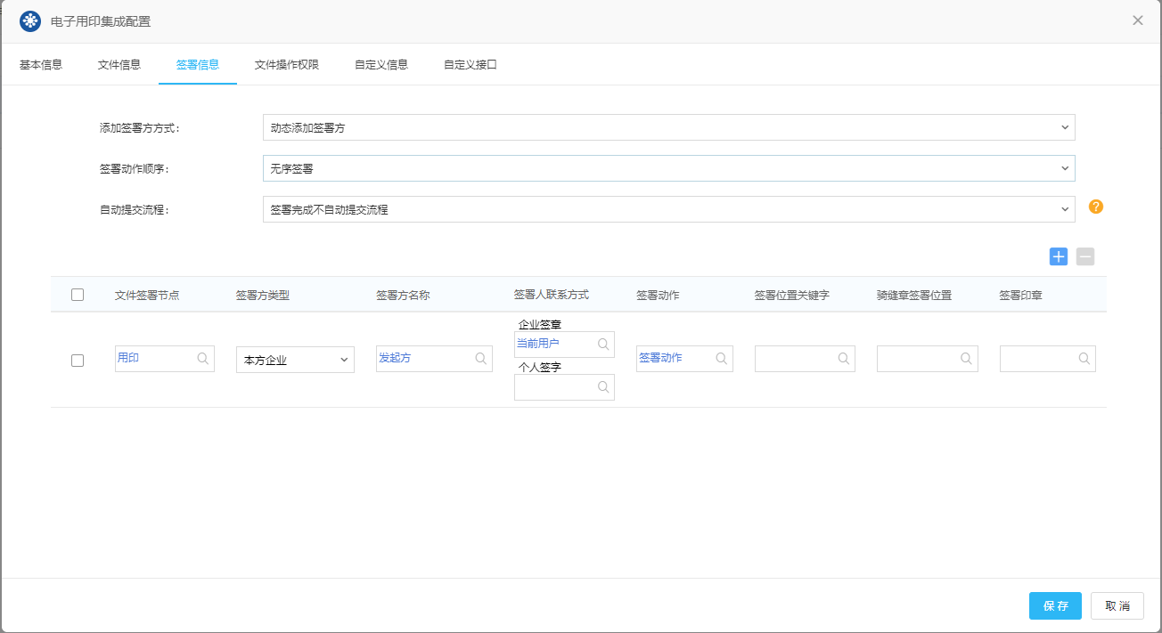 打开发文流程,需包含以下四个字段:发起方、业务分类、签署动作、用印文件。字段类型见下图: