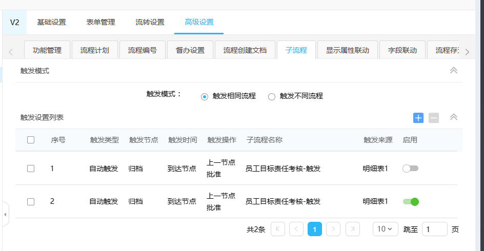 1)流程引擎--->路径管理---->路径设置--->找到对应的流程--->点击高级设置下面的子流程选择子流程触发的类型(触发相同流程和不同流程),设置触发类型(自动/手动),触发时间,触发节点,子流程名称。