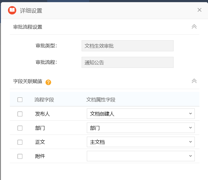 2)创建一个文档目录:登录OA后台--->内容引擎--->目录设置--->文档目录--->在对应的目录下面创建下级目录--->基本信息的功能设置中打开新文档阅读提醒(勾选消息中心提醒)--->基本信息的附件设置--->设置文件上传的大小格式等--->权限管理中设置共享,维护,创建,复制,移动权限---->文档审批→状态中选择启用审批工作流--->工作流设置中设置文档生效审批--->选择对应流程--->详细设置中对应字段