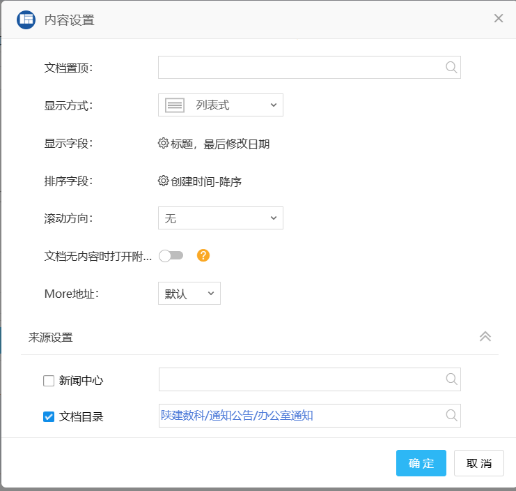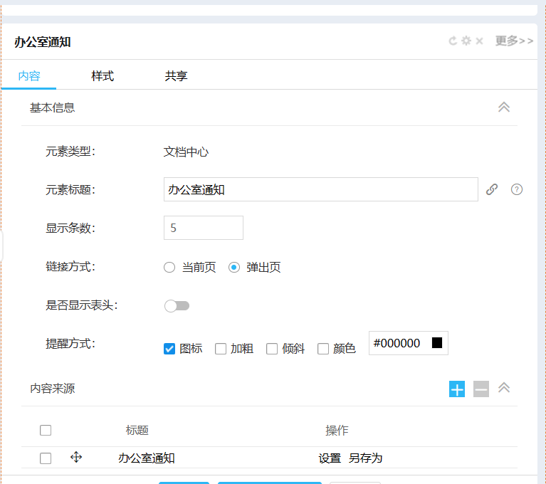 3)门户上添加模块:门户引擎--->登录后页面---->修改数科门户--->添加一个文档中心--->点击设置,更改元素标题(自己需要设置的标题名字)--->内容来源中点击“+”添加一个通知内容--->设置内容,显示字段,排序字段--->选择来源设置文档目录(选择文件附件存放的目录)