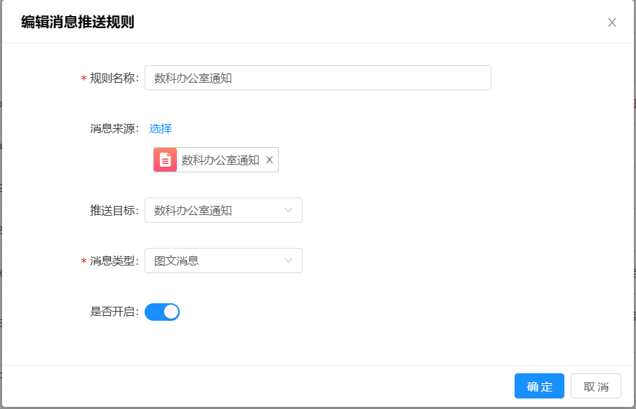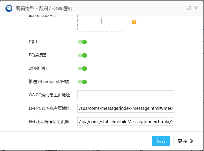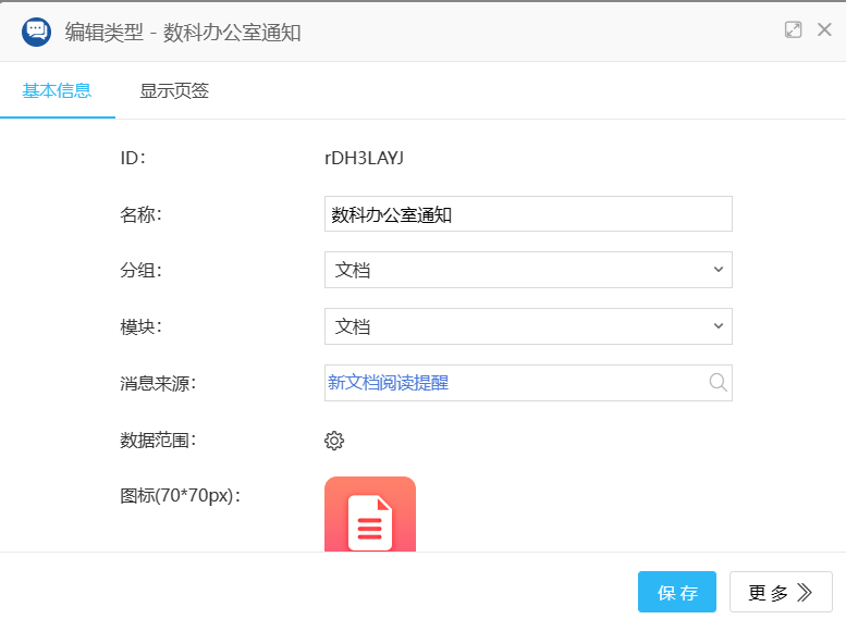 5)OA系统管理员账号:OA后端页面--->应用中心--->消息中心--->消息类型设置--->点击新建--->填写名称,分组,模块(分组和模块选择文档)--->消息来源选择新文档阅读提醒--->数据范围(需要发送消息的目录,与门户和流程附件上传中设置的目录一致)--->打开下面的四个开关--->保存。