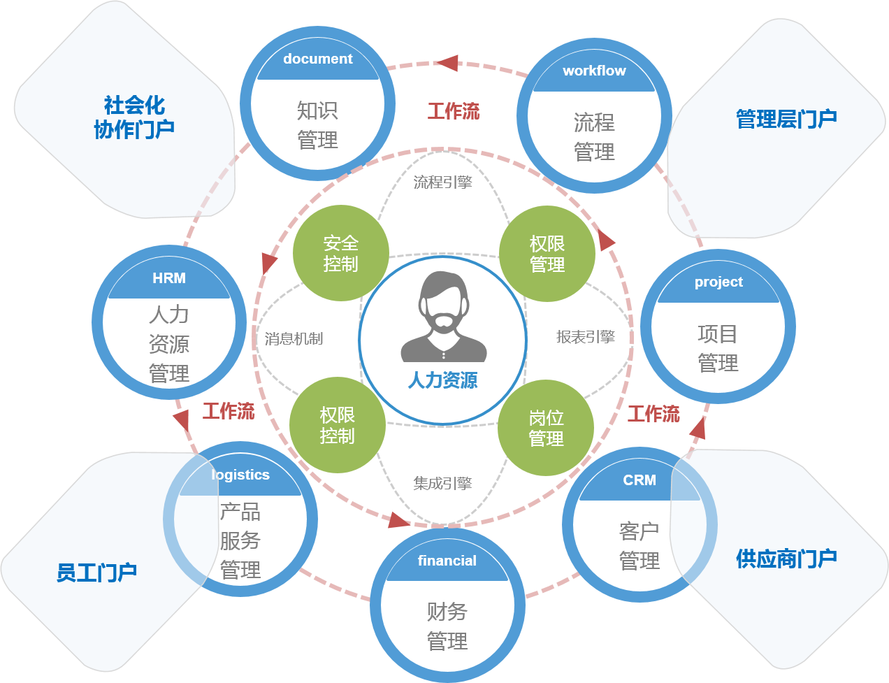 以组织人员为核心,构建整个系统的权限架构体系,基于整体的组织权限架构 ,构建整体的应用 ,通过流程作为血脉带动所有应用的运转,从而为企业、为不同角色用户提供协同管理的应用。