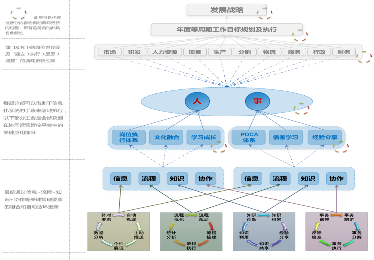组织的生命力,涉及到企业中的诸多要素,并且依赖这些要素的循环优化更新获得动力,是一个动态循环的管理生态系统!正如下图所示,在企业发展战略的指导下,企业通过IT生态系统,构建起多个有序交错的PDCA管理闭环,形成企业中人、财、物、流程、知识、信息等多种要素的协同效应,进而形成岗位执行体系、文化融合、个人和组织的学习成长、管理闭环的组织状态,从而服务于企业的可持续发展。