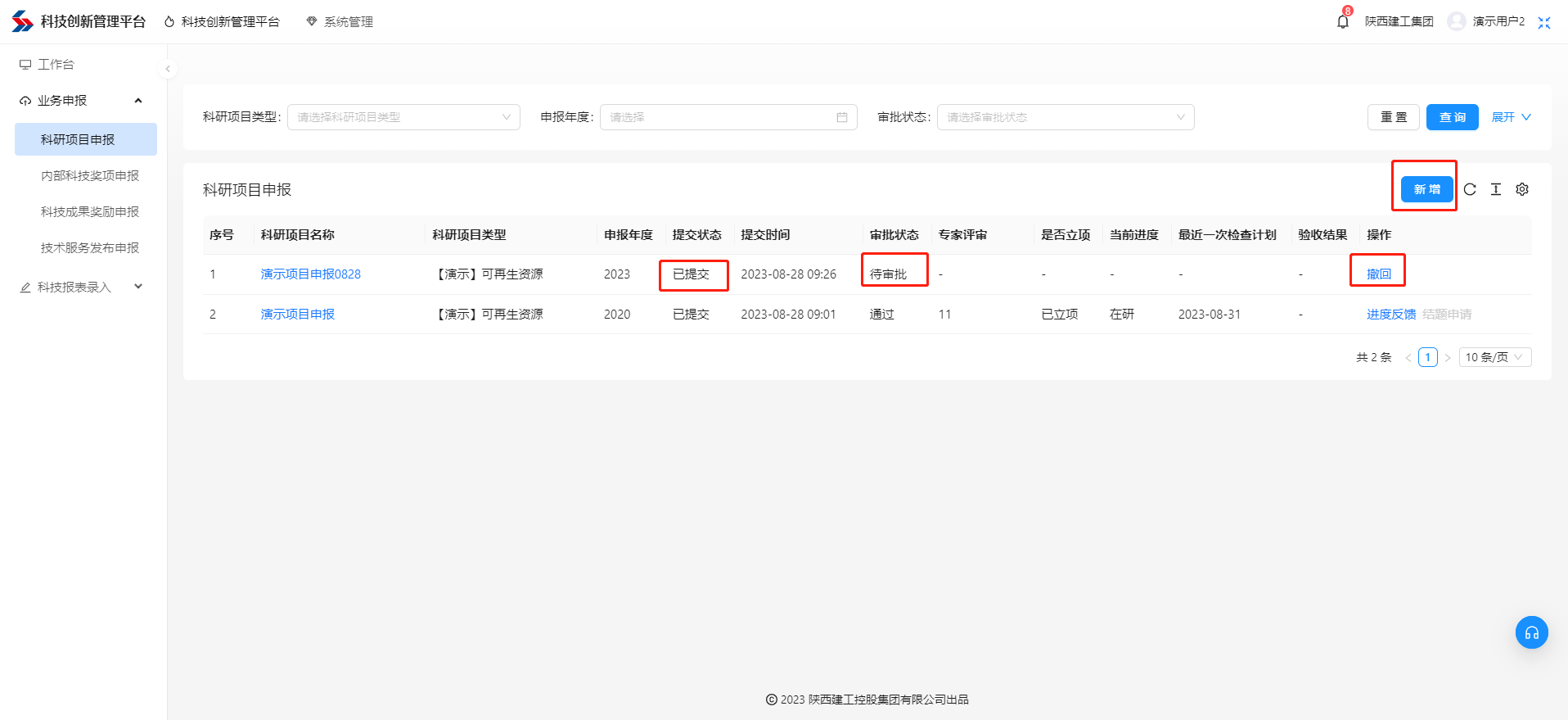 已发起的申报信息,可在列表中查看审批状态,待审批状态下支持“撤回”申报流程。