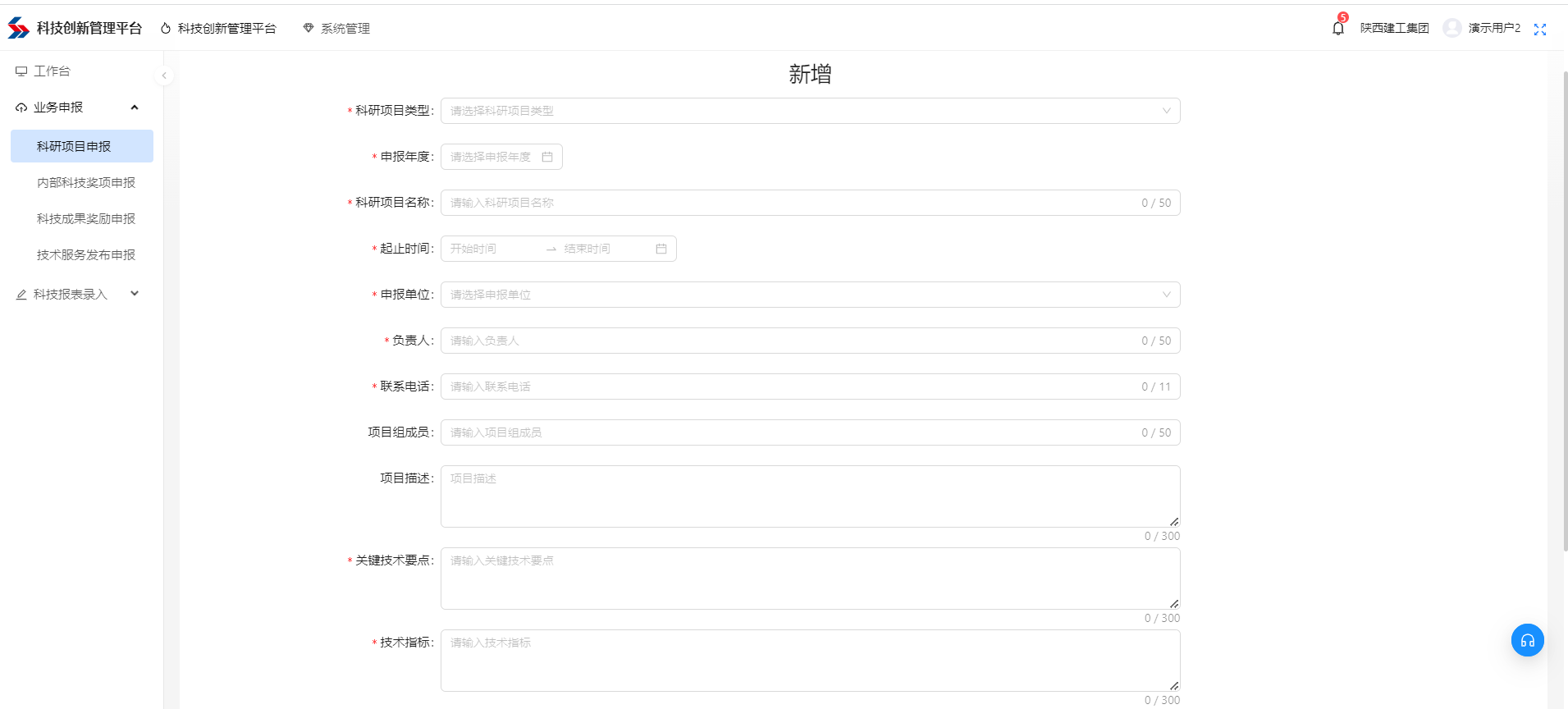 点击“新增”按钮,打开科研项目申报页,填写申报信息,所有带“*”为必填信息。信息填写完成点击“提交”即可。
