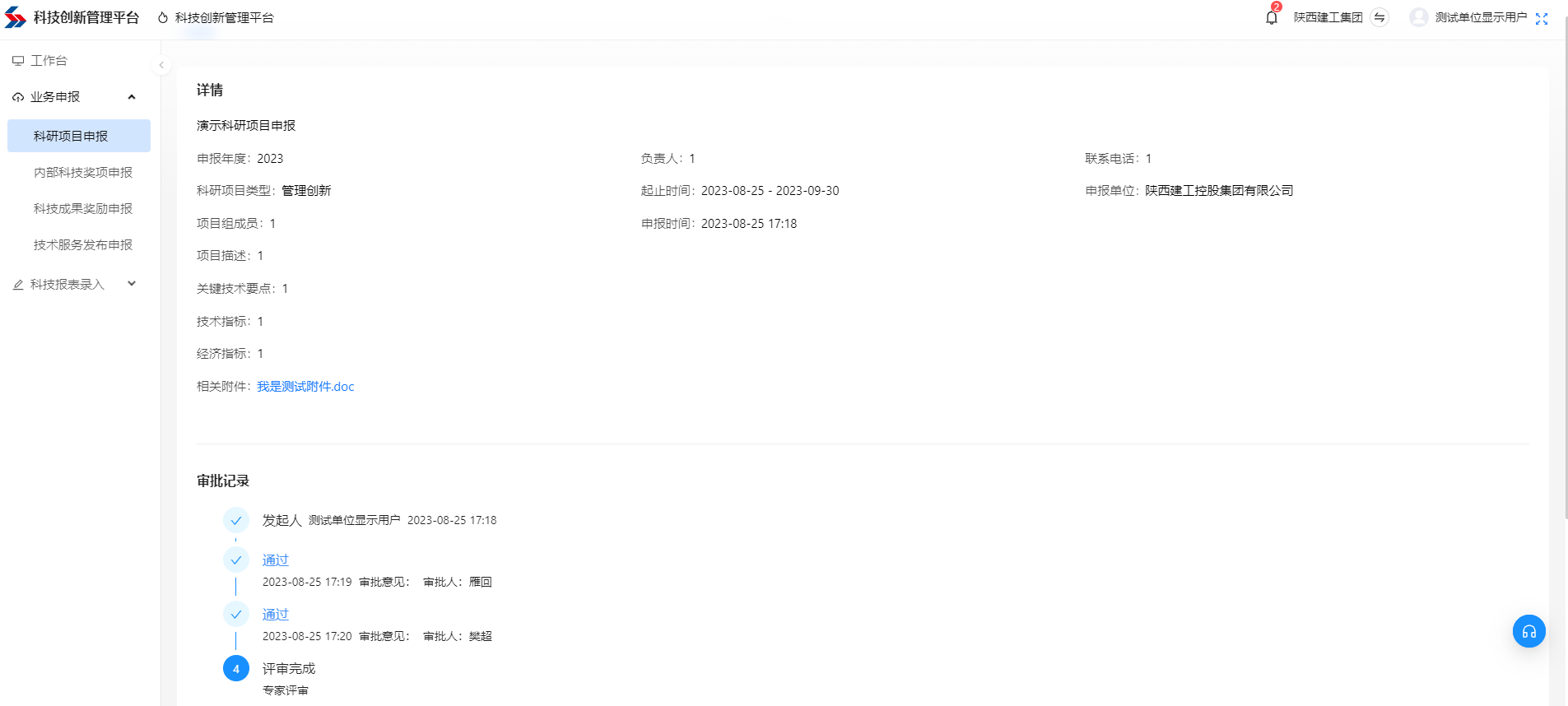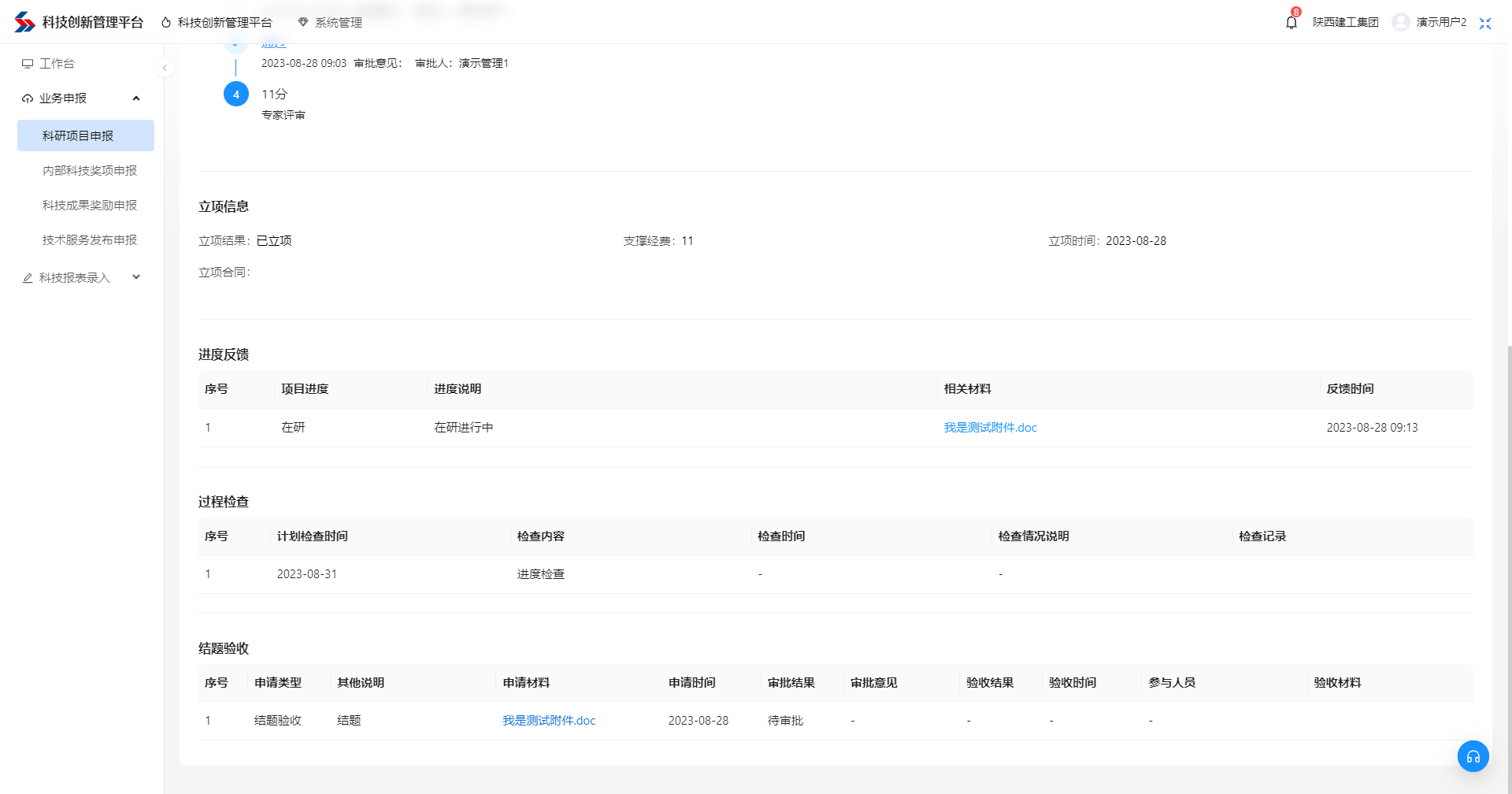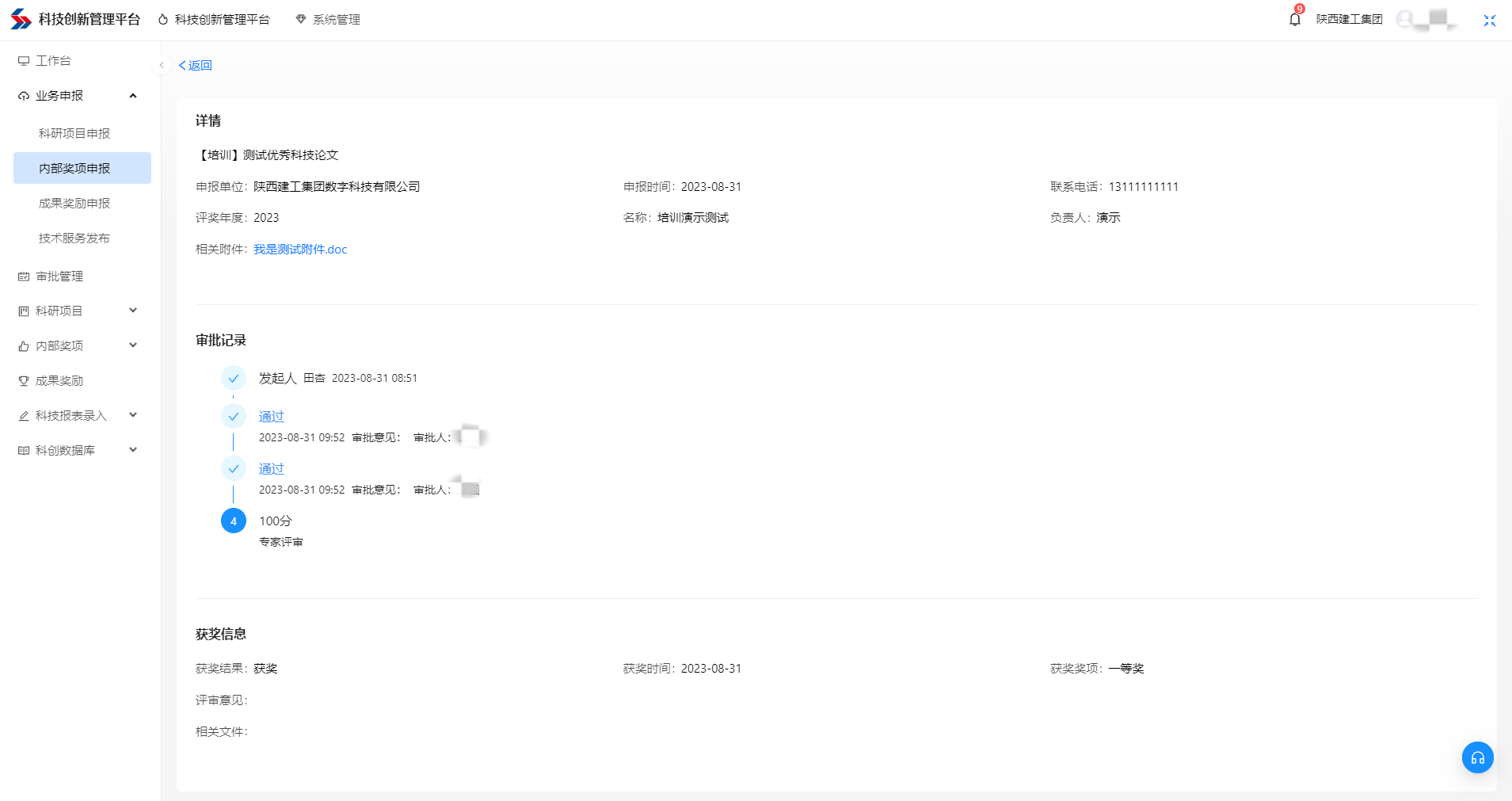 点击“科技成果名称”,进入详情页,可查看当前的申报奖项的审批进度。