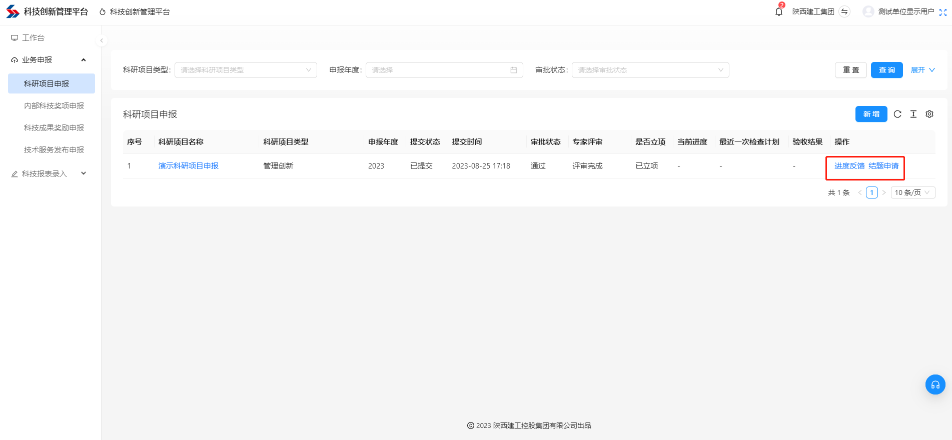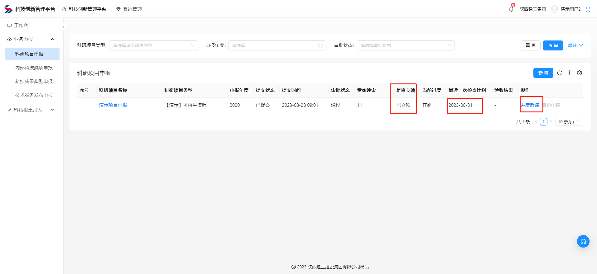 当科研项目通过立项后,在操作栏可进行项目进度反馈。