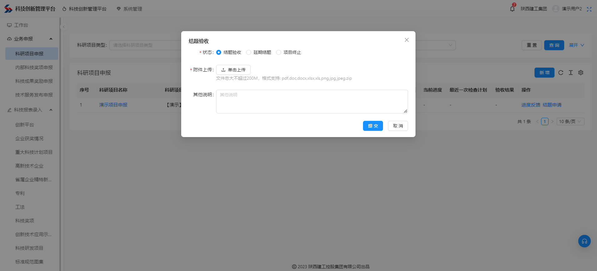 结题验收:选择状态为结题验收,填写相关申请附件及说明后,点击“提交”,则发起结题申请,由本单位管理人员及集团管理人员审批通过后,项目进入验收阶段。