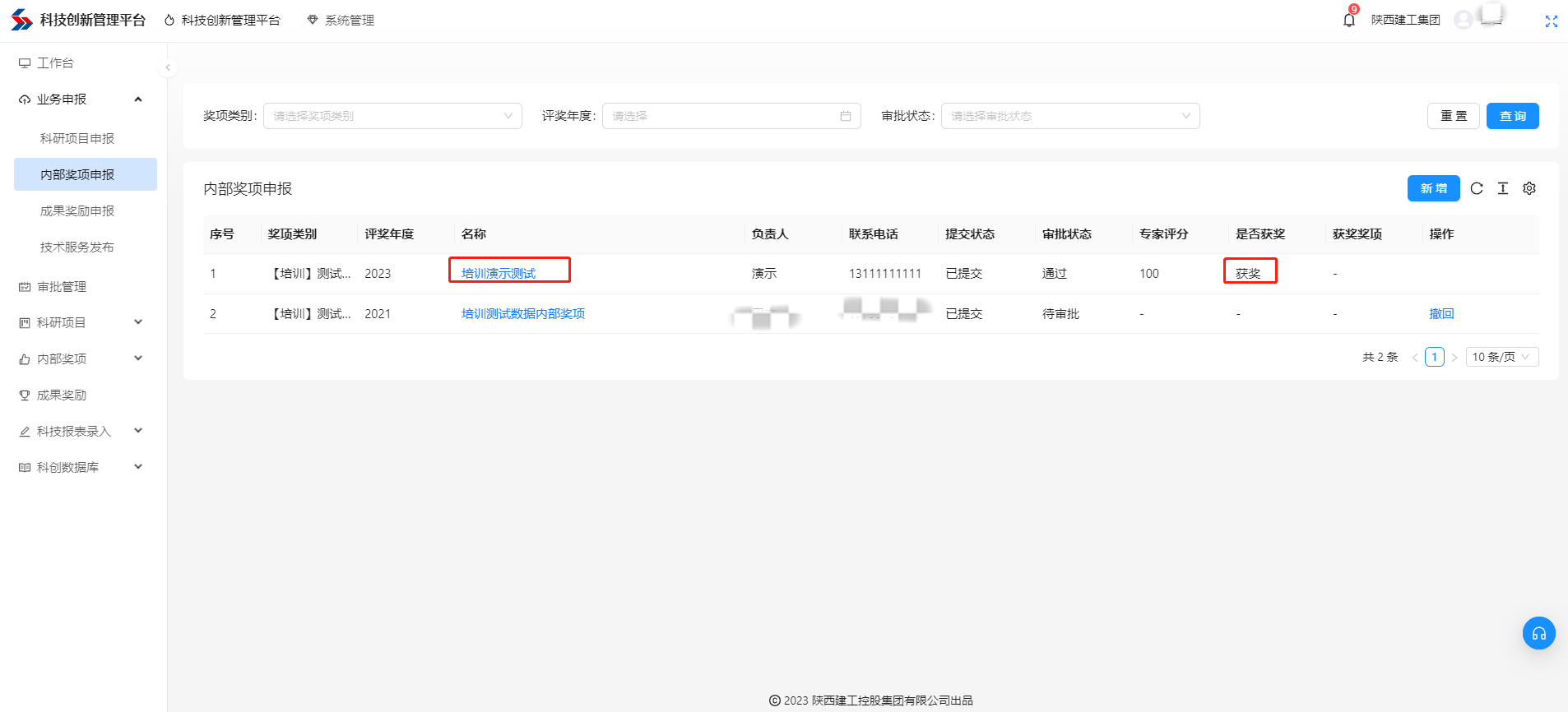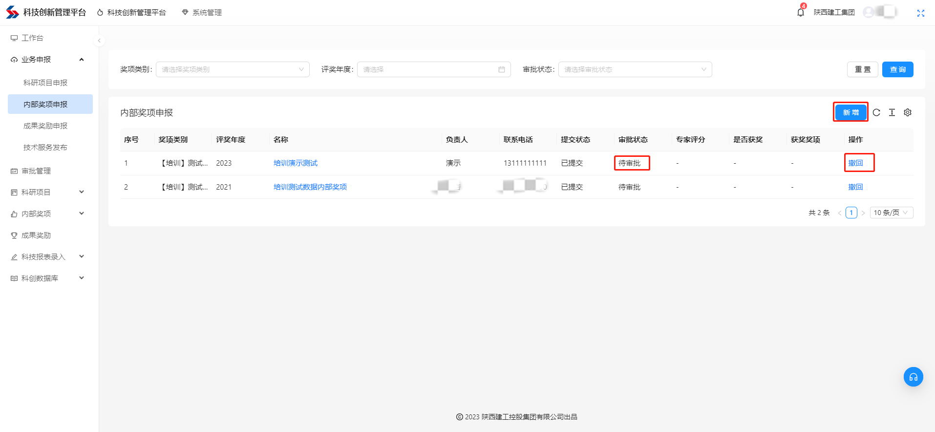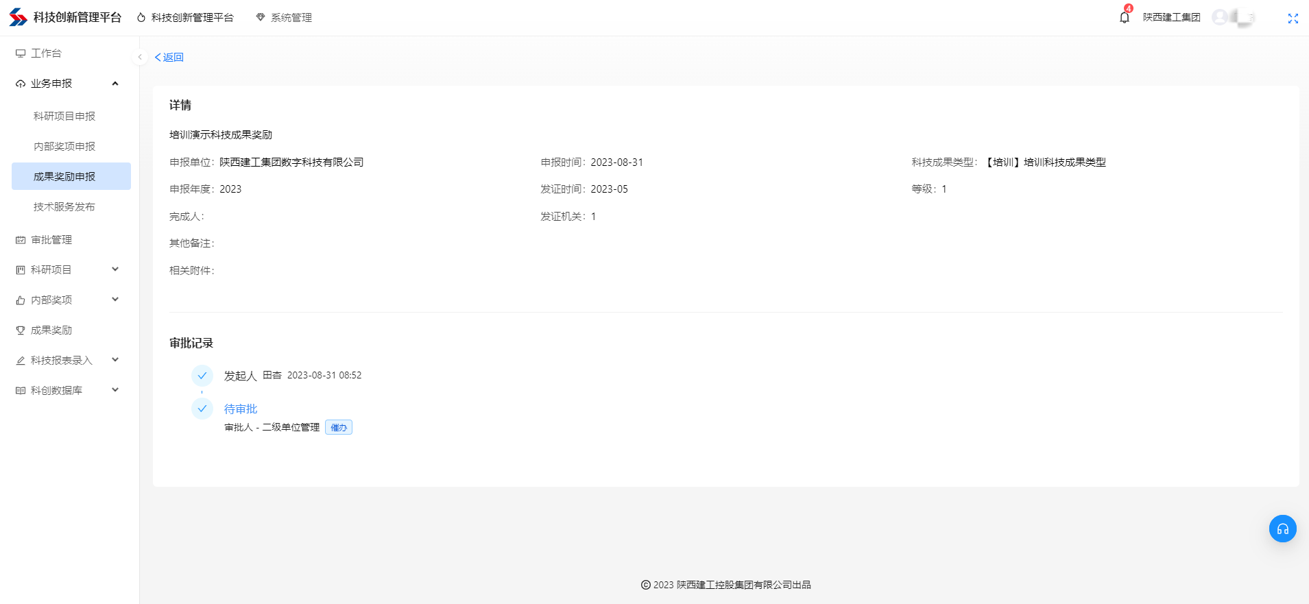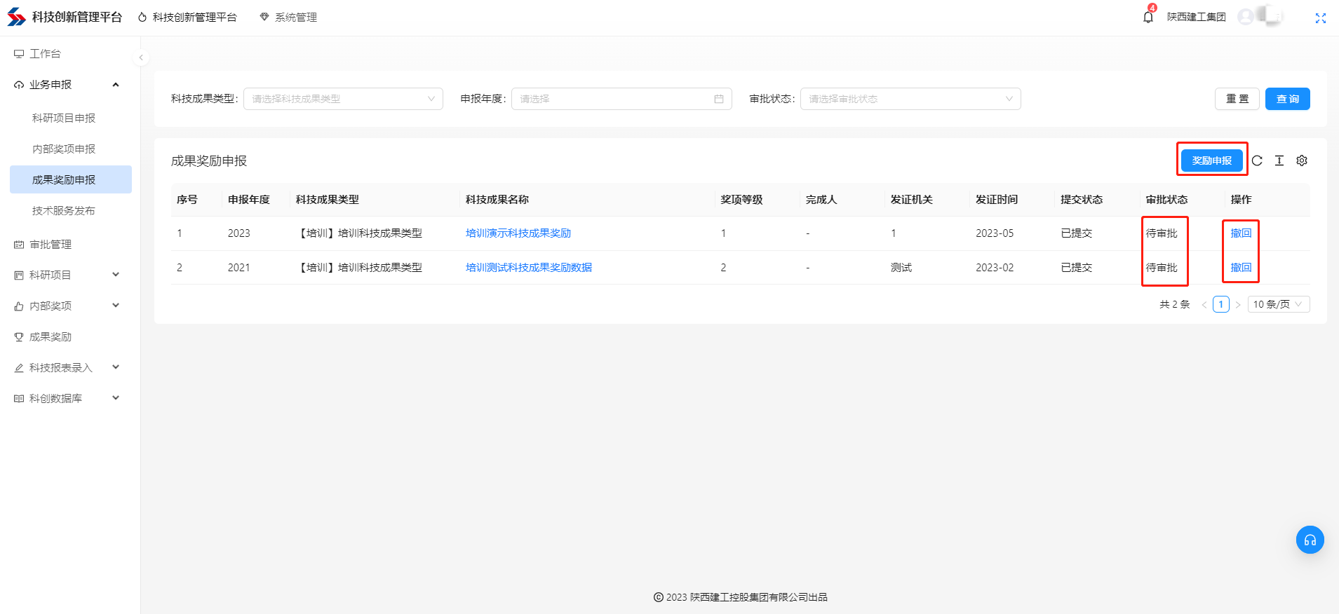 已发起的成果奖励申报,可在列表中查看审批状态,待审批状态下支持“撤回”申报流程。