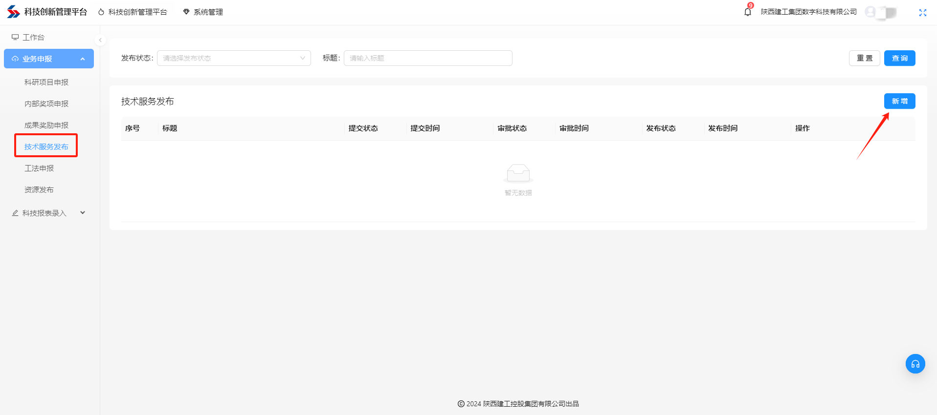 点击“新增”按钮,打开技术服务发布页,填写技术服务信息,所有带“*”为必填信息。信息填写完成点击“提交”即可。