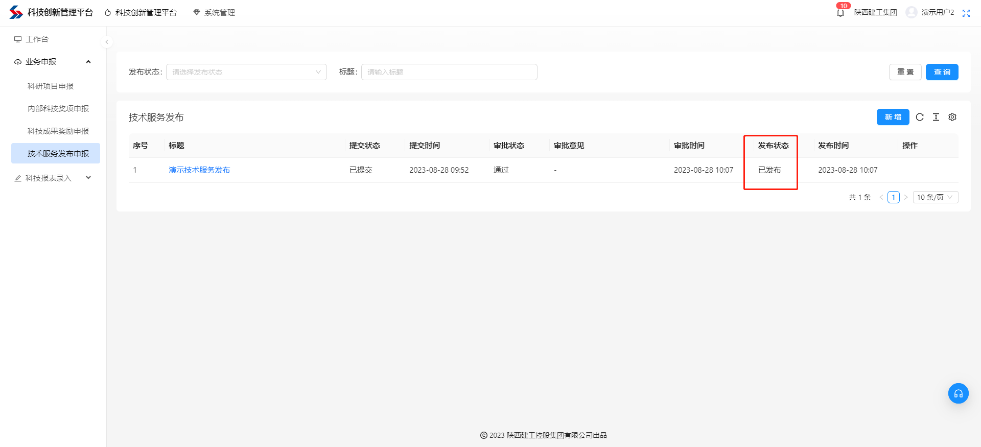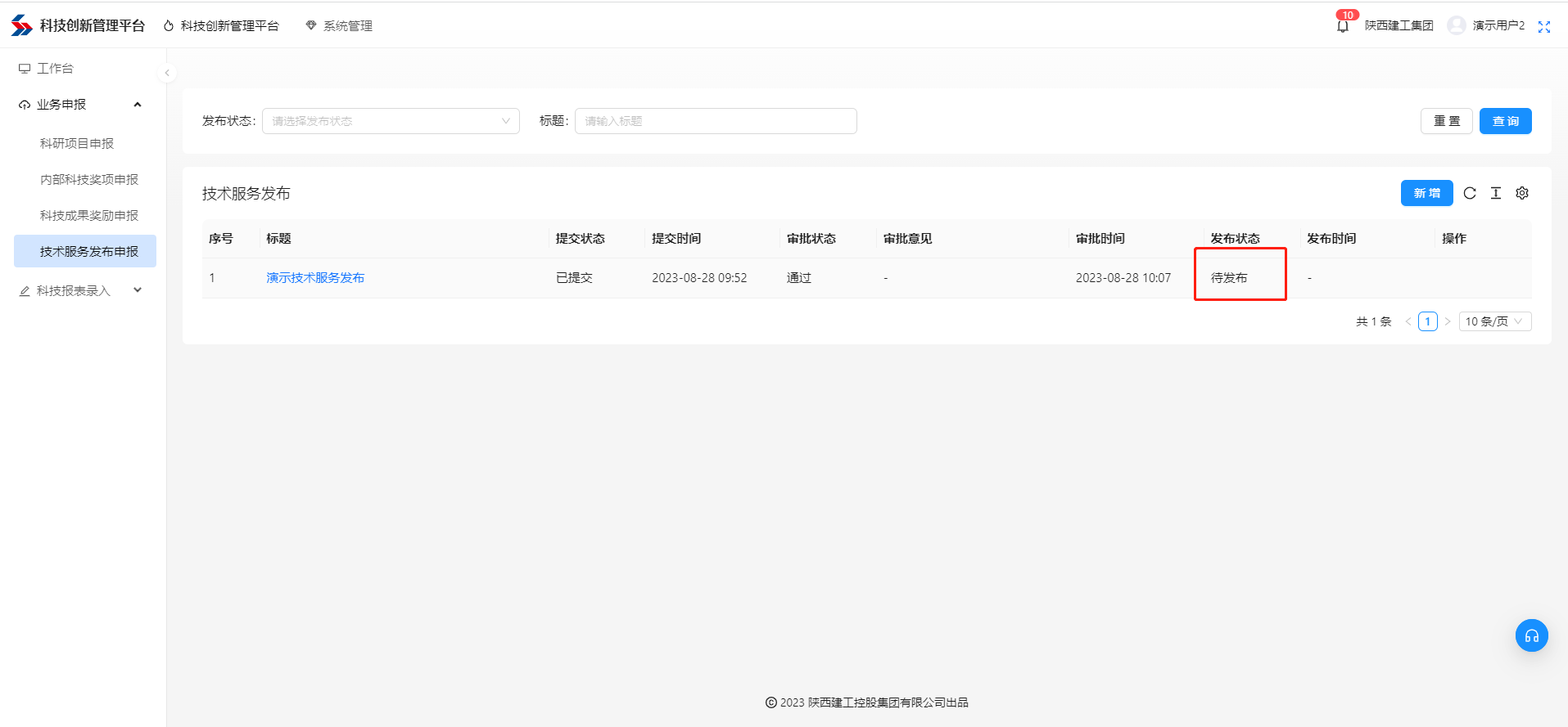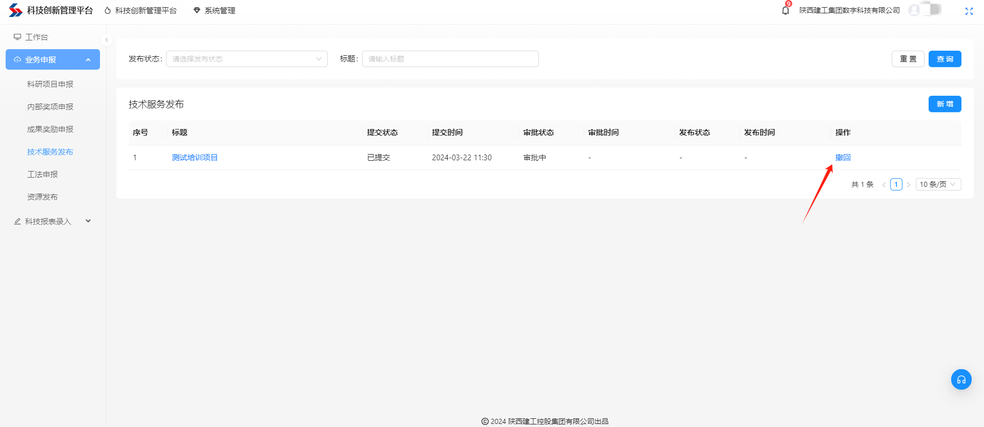 已发起的技术服务发布申请,可在列表中查看审批状态,待审批状态下支持“撤回”申报流程。