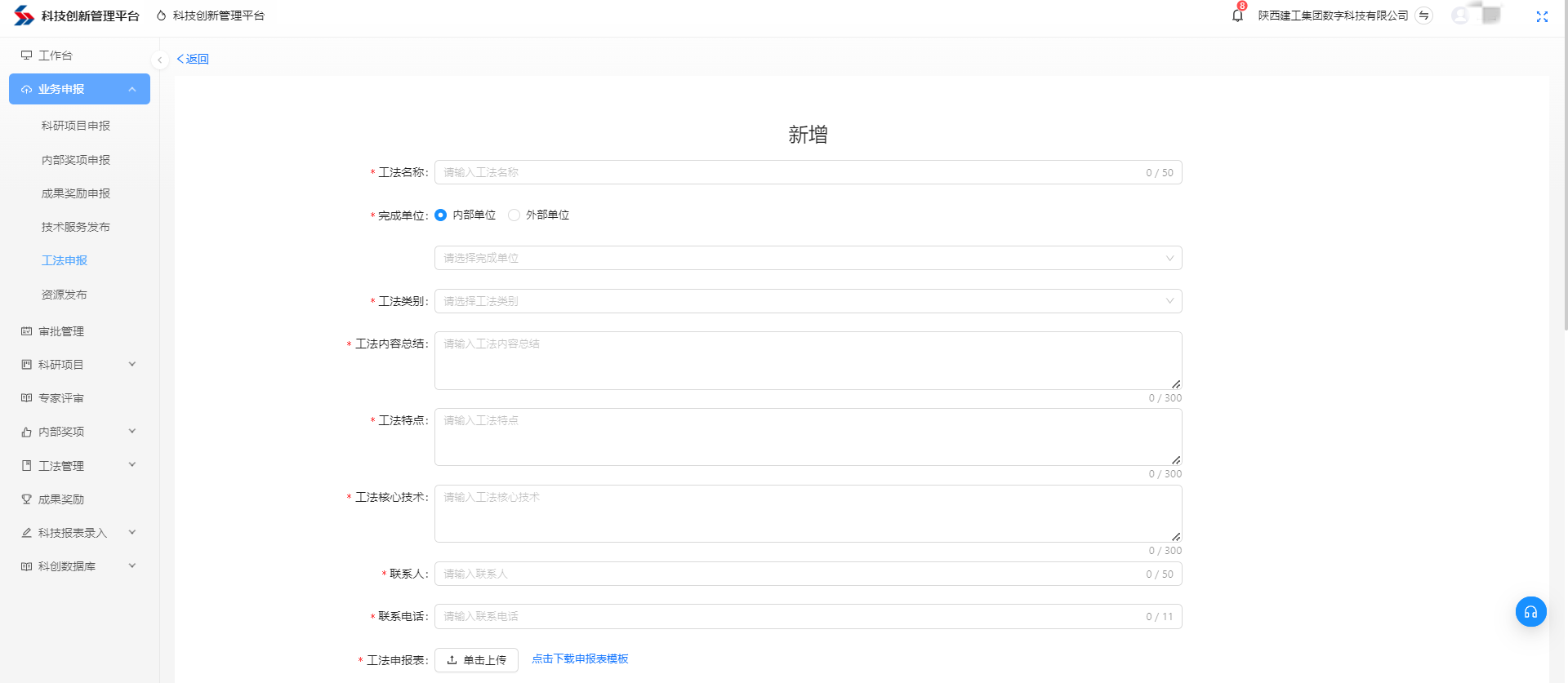 点击“新增”按钮,打开工法申报页,填写申报信息,所有带“*”为必填信息。信息填写完成点击“提交”即可。