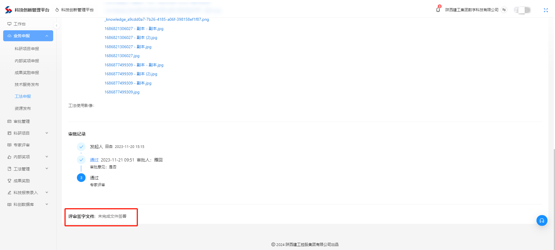 点击“工法名称”进入工法申报详情页。如当前申报已完成专家评审,可在详情页审批记录之后,查看及下载电子版专家评审签字文件《关键技术审定表》。
